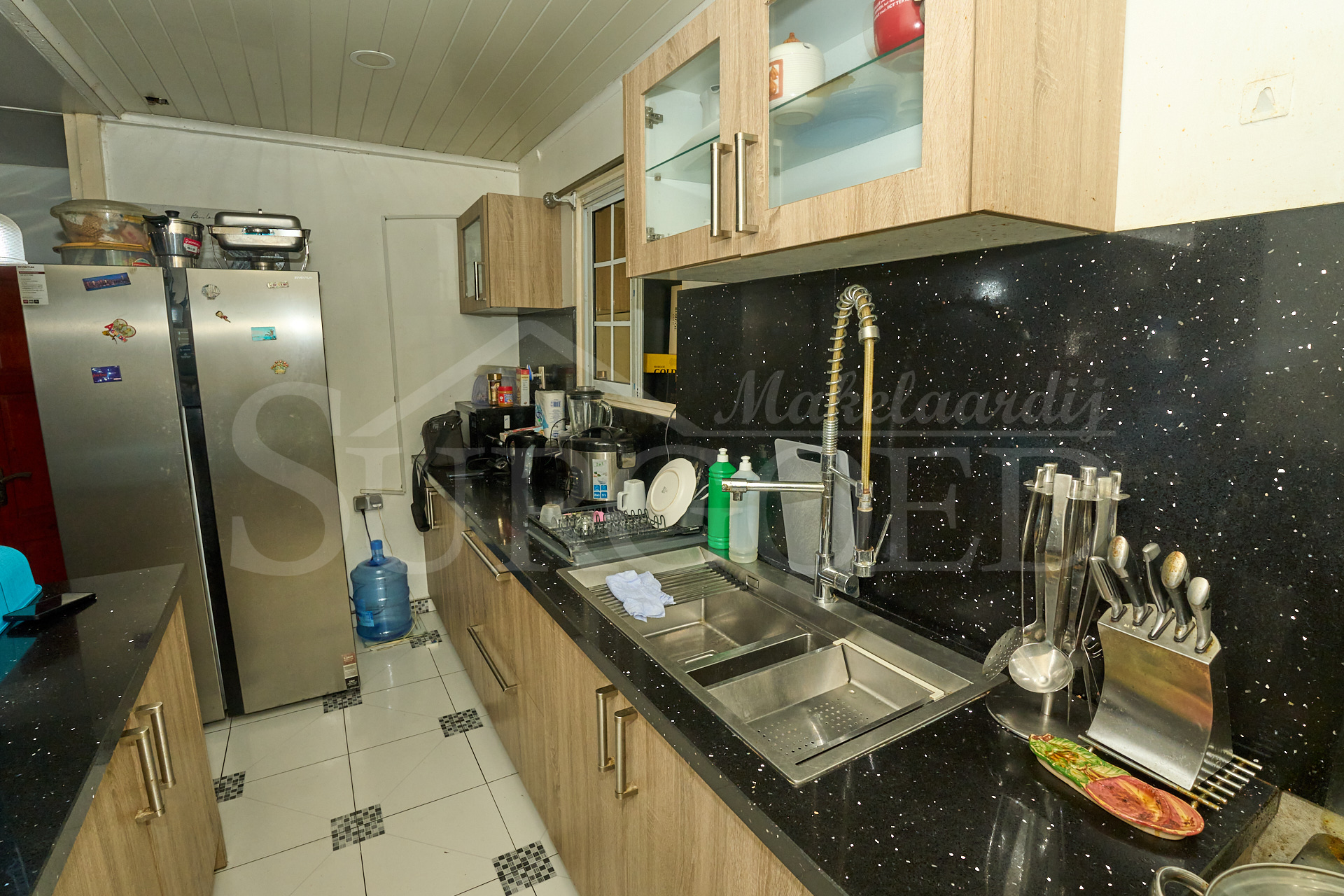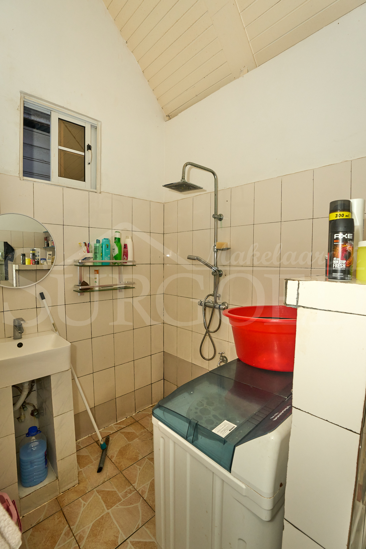 Beneden bevindt zich een compact maar aangenaam woondeel met een overdekt voorterras, carport, een semi-moderne keuken, een intieme living en een masterroom met eigen douche en toilet.